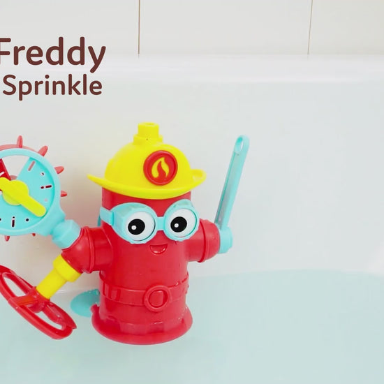 Solo debes colocar la base dentro del agua y fijar a Freddy al costado de la bañera con sus ventosas. Al tirar la palanca, comienza la acción: el agua circula y activa los distintos accesorios para que niñas y niños puedan convertirse en verdaderos bomberos y bomberas.